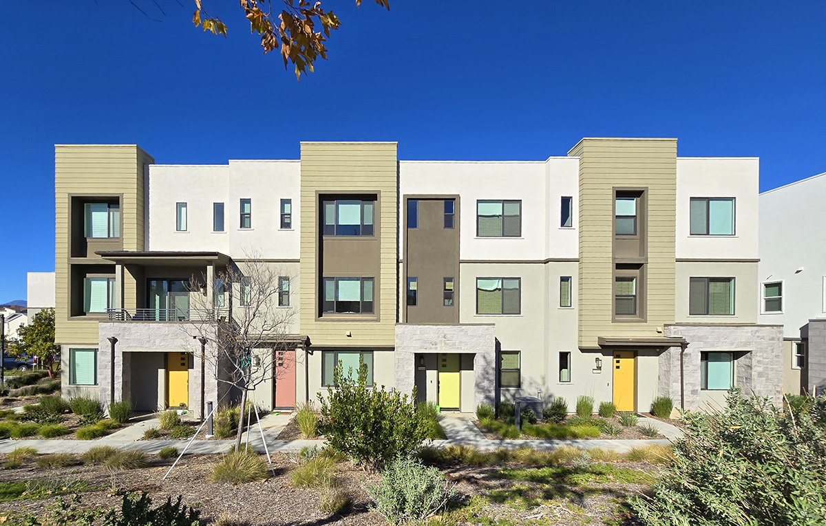 Calla at Valencia is a thoughtfully designed townhome collection that blends modern architecture with everyday livability in Confluence Village at Valencia by FivePoint. The streetscape feels cohesive and intentional, with clean contemporary lines, warm materials, and repeating architectural elements that create a welcoming neighborhood rhythm rather than a row of identical homes.