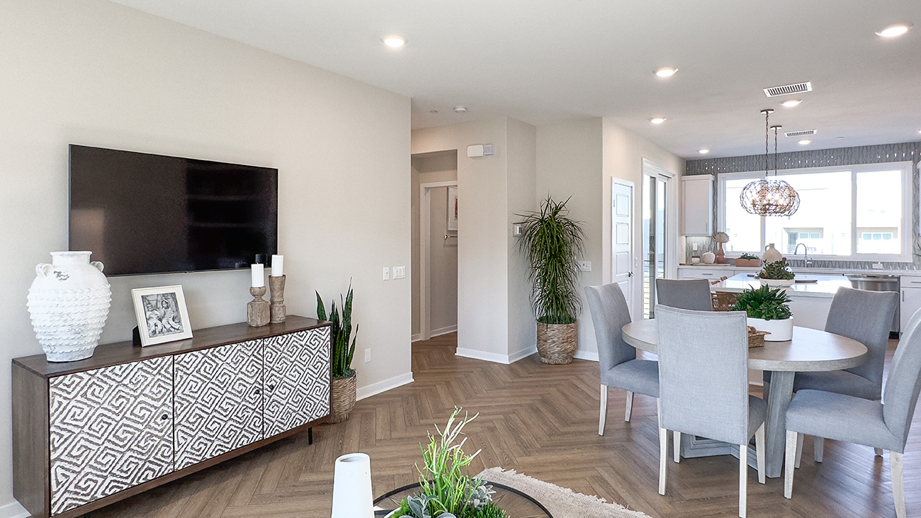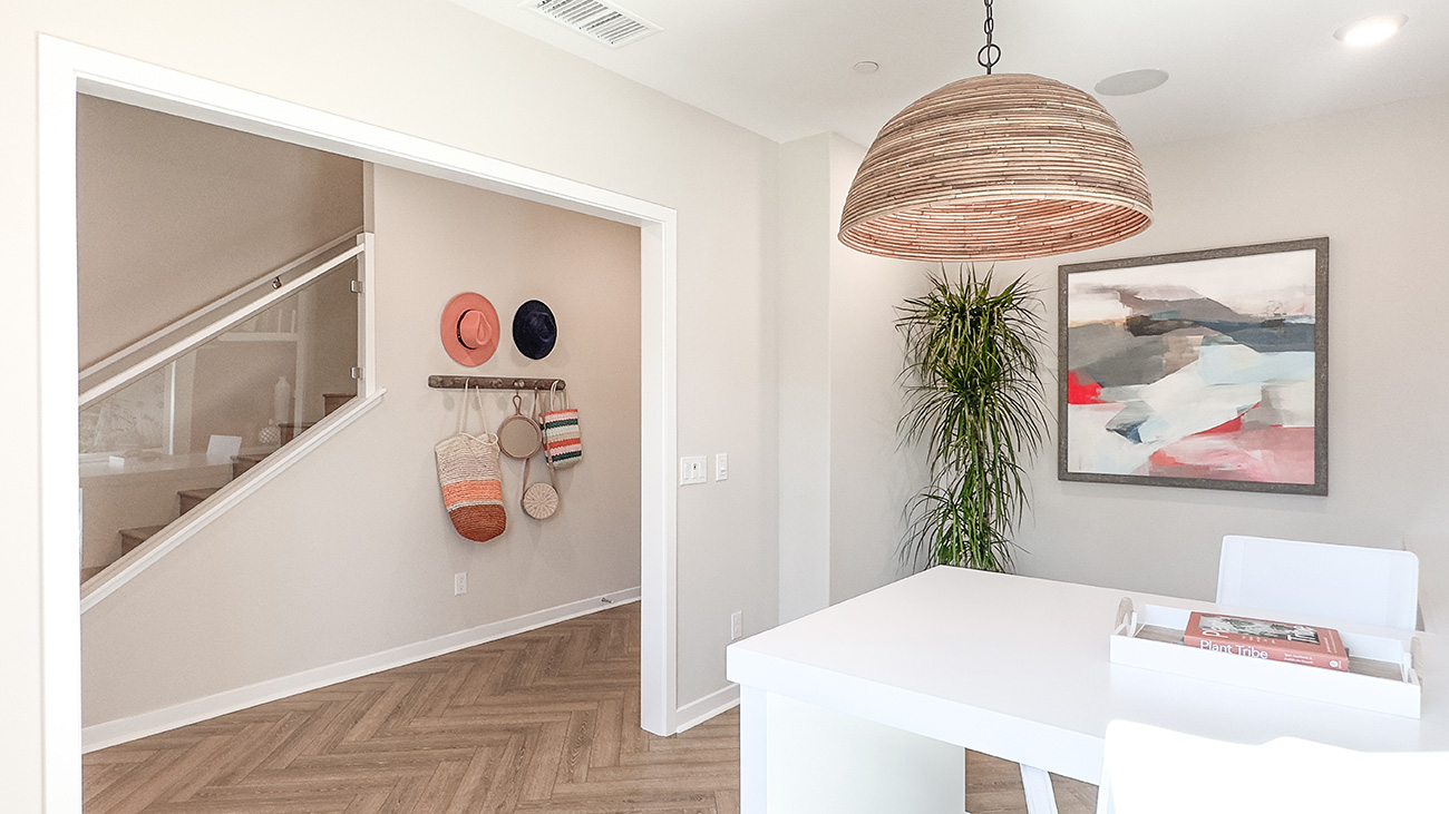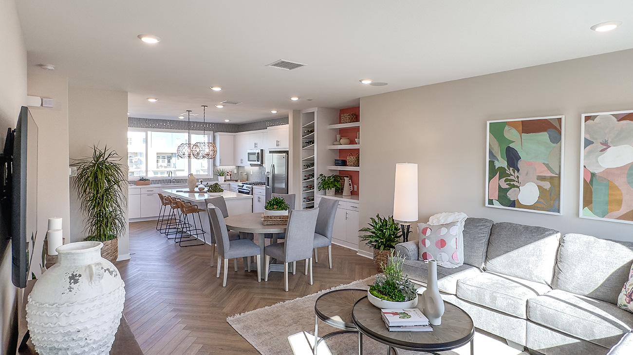 Calla Plan 1 is a three-story townhome that offers a smartly layered layout designed for both function and flow in Valencia by FivePoint. The entry level welcomes residents with a flexible office space and direct access from the attached two-car garage, while the main living areas are positioned on the second floor to create an open, light-filled environment where the kitchen, dining area, and great room connect naturally.