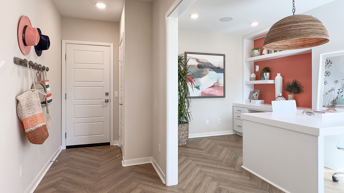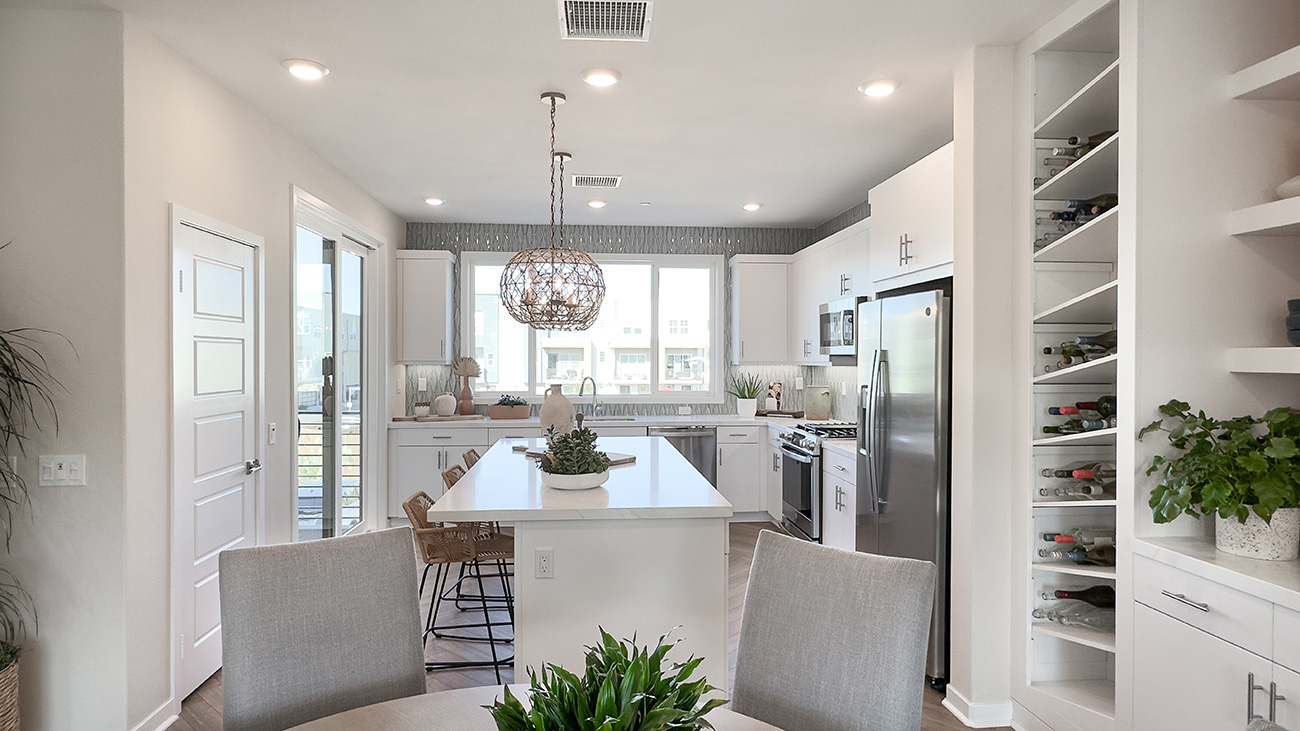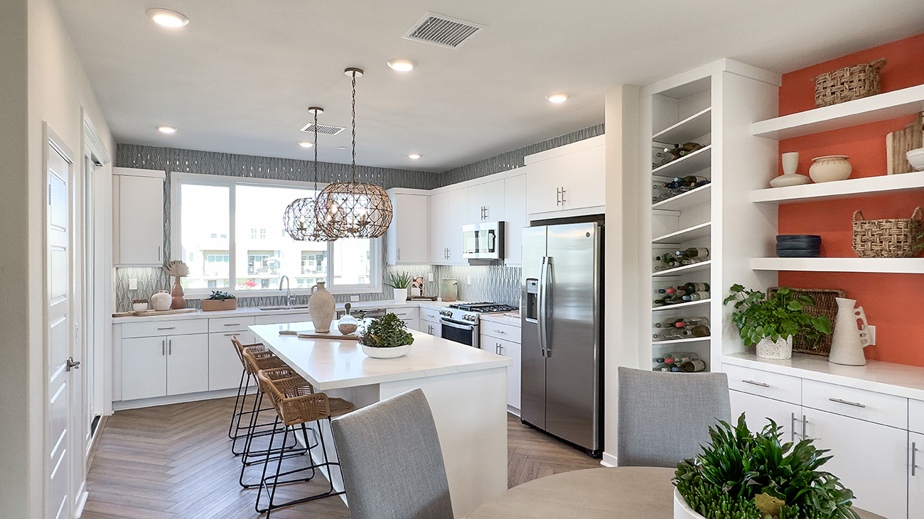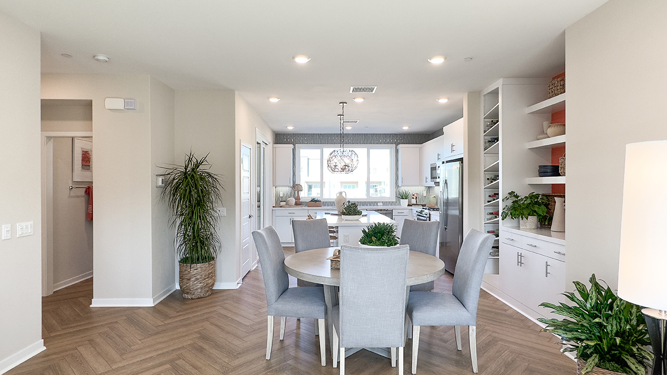 Calla Plan 1 is a three-story townhome that offers a smartly layered layout designed for both function and flow in Valencia by FivePoint. The entry level welcomes residents with a flexible office space and direct access from the attached two-car garage, while the main living areas are positioned on the second floor to create an open, light-filled environment where the kitchen, dining area, and great room connect naturally.