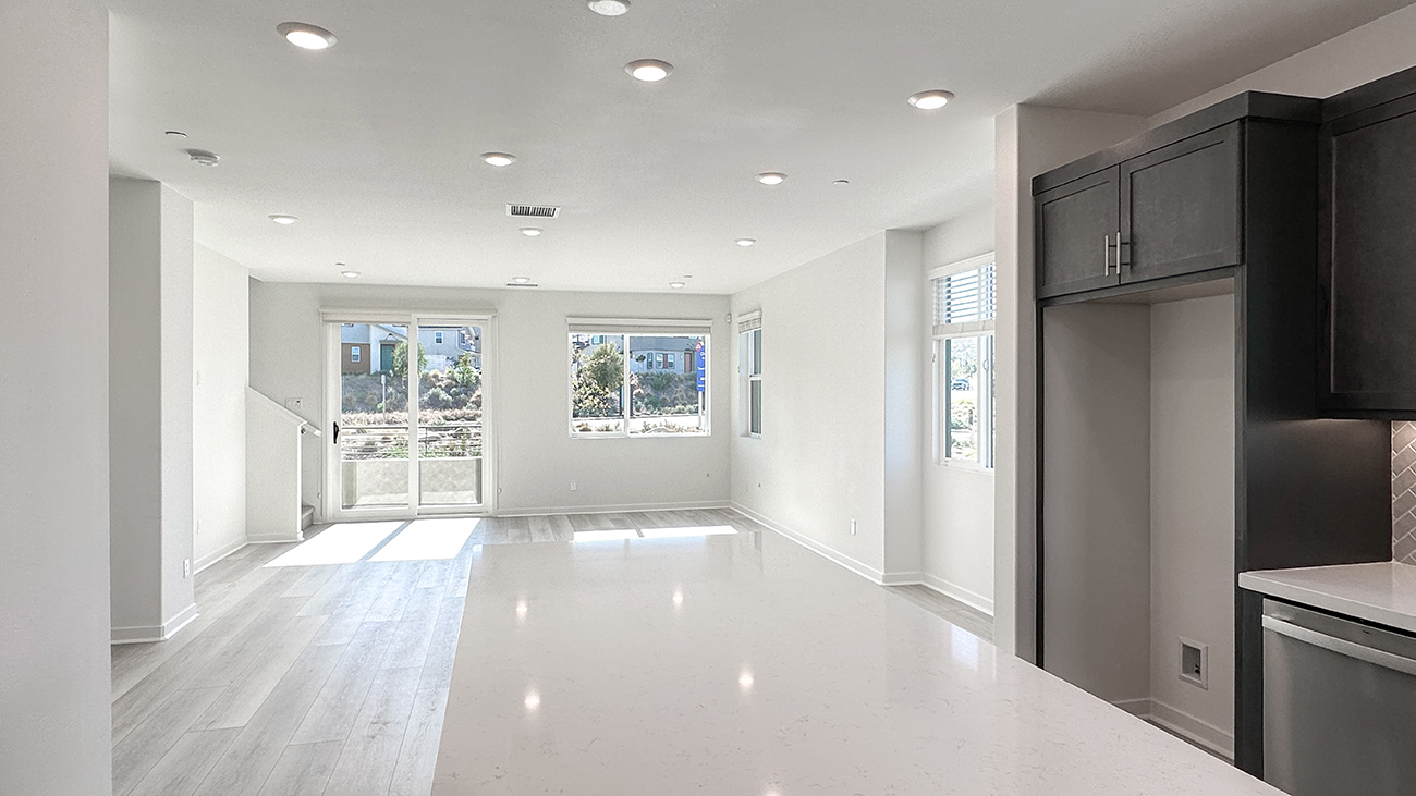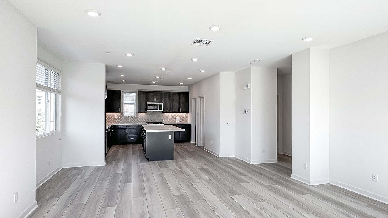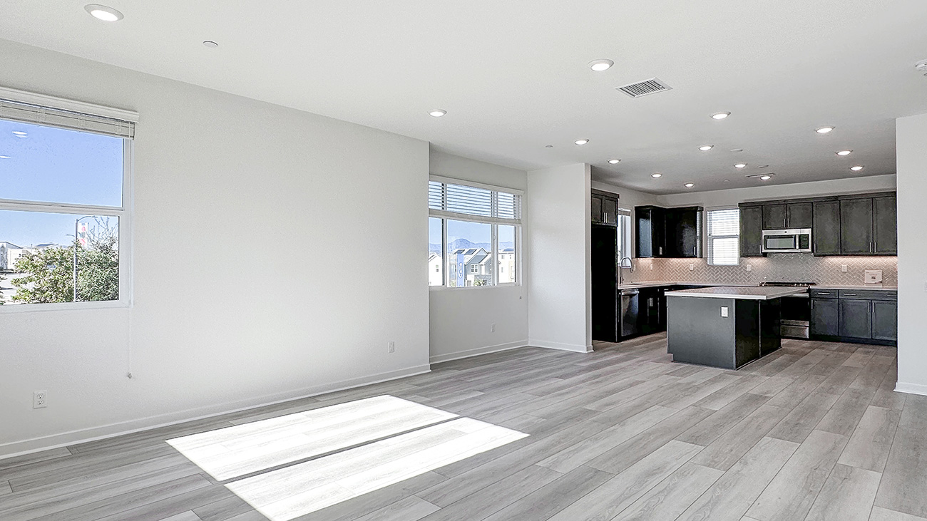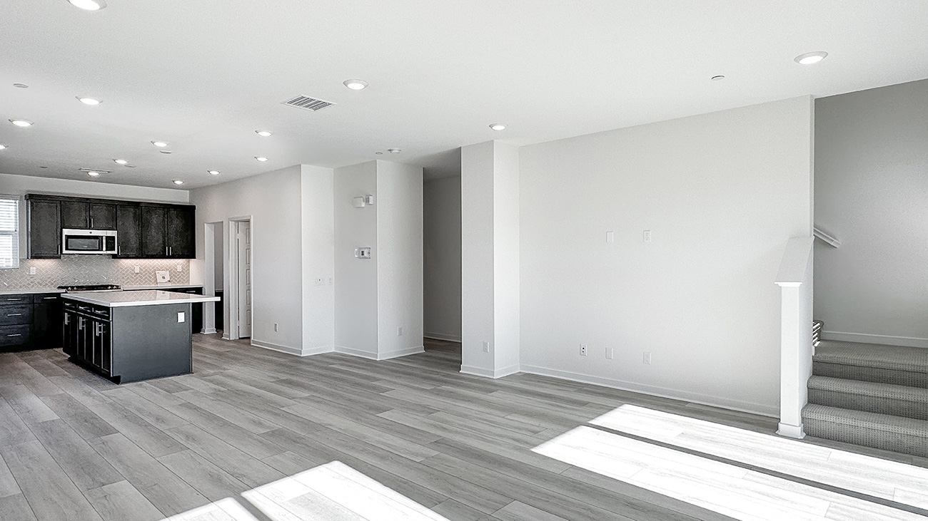 Plan 3 is a three-story townhome design that places everyday living at the center of the home. The original model was un-decorated, so the photos show you the general layout of the home. The main living level is open and inviting, with the kitchen, dining area, and great room flowing together to create a comfortable space for daily routines, gatherings, and relaxed evenings at home.