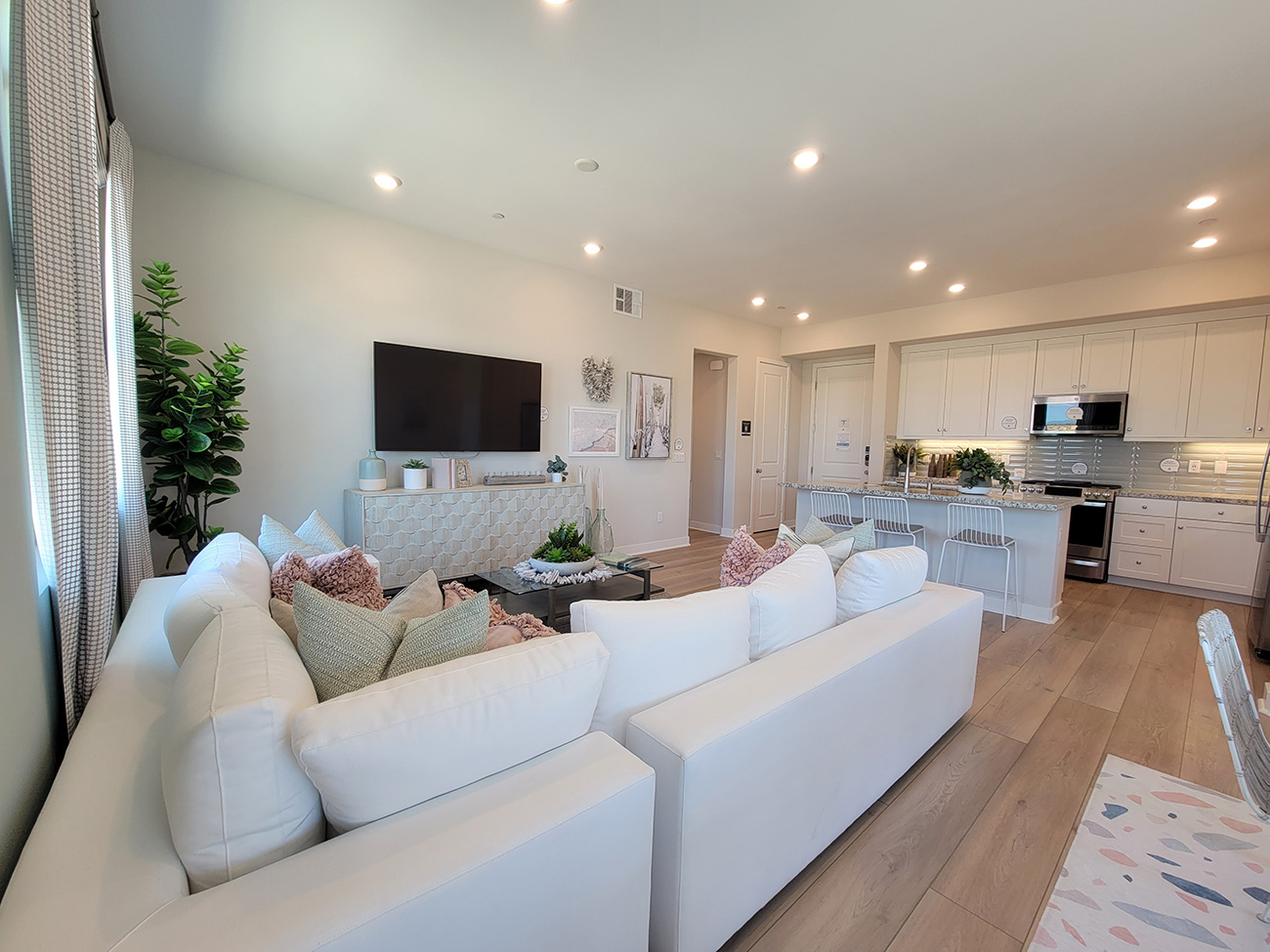 Tucked privately to one side, the owner’s suite offers a quiet retreat with a walk-in closet and spa-inspired bath, while the secondary bedroom sits near a full bath, ideal for guests or flexible use as a home office. Buyers are drawn to the thoughtful single-level design, detached two-bay garage, and the modern finishes Lennar is known for — especially those looking for a low-maintenance Lennar flat in Valencia by FivePoint that still feels open, bright, and welcoming.