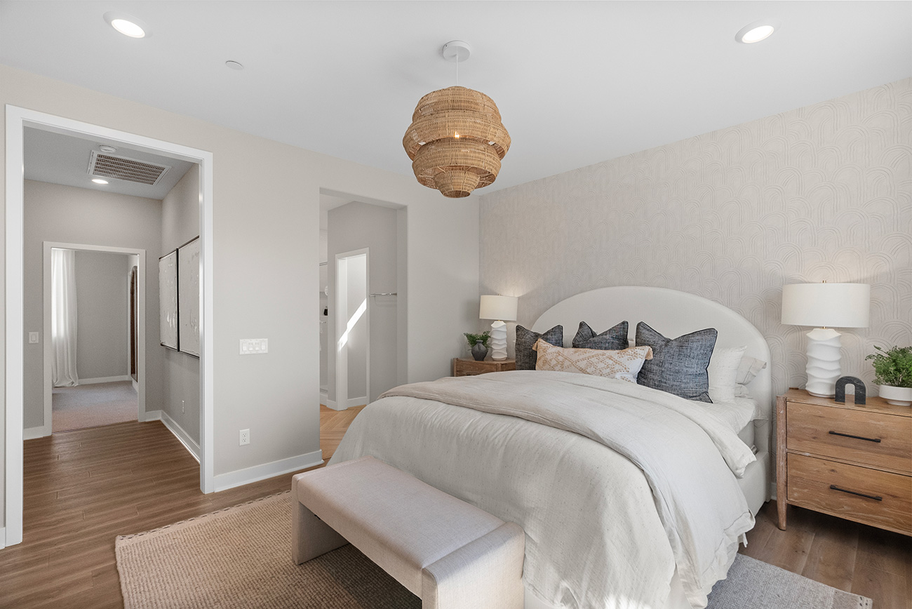 On the second level, the kitchen, dining area, and great room flow together naturally, creating a relaxed space for daily living and casual gatherings. A private deck extends the living area outdoors, adding to the home’s appeal. Upstairs, both bedrooms are tucked away for privacy, including a comfortable owner’s suite with a walk-in closet and nearby laundry. Plan 1 is especially well-suited for buyers looking for a modern Lennar townhome in Valencia by FivePoint with clear separation between work, living, and rest.