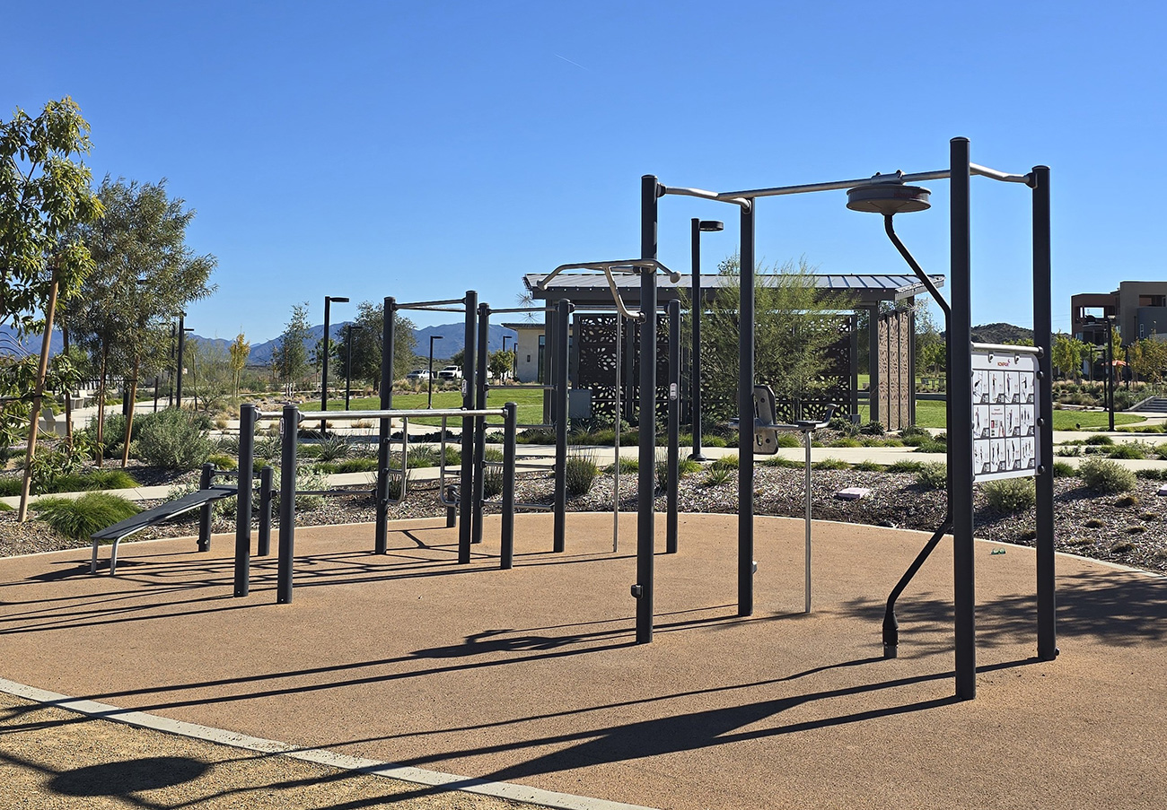 Outdoor fitness zone with pull-up bars and workout stations